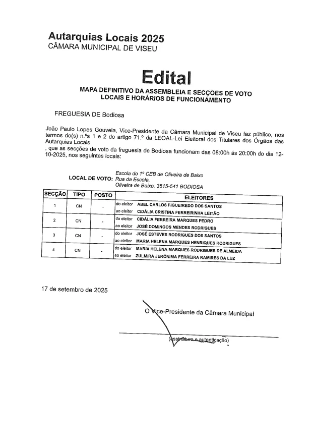 Autarquias Locais 2025 - Mapa da Assembleia e Secções de Voto (Ver Edital)