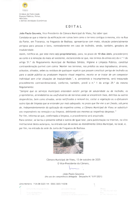 Edital - Limpeza de terreno 2025 - Rua de São Bento - Oliveira de Cima, Freguesia de Bodiosa (Ver Edital)